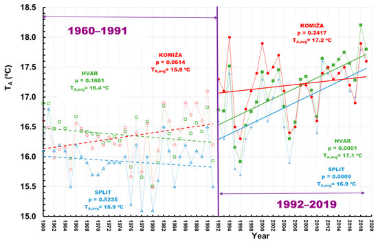 Time series of the mean annual air temperature measured at Split, Hvar, and Komiža stations. TA, avg is an average value of the mean annual air temperature, and p represents M–K test values, calculated for two sub–periods defined by the results of RAPS.