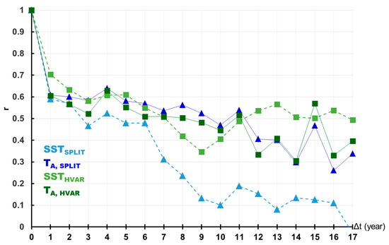 Autocorrelogram of the mean annual SST and the air temperature (TA) time series measured at stations in Split (blue) and Hvar (green). Δt refers to the year in a sequence.