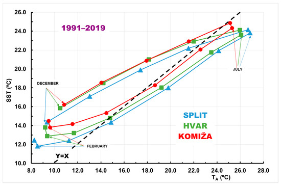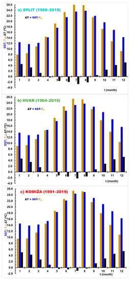 The following are available online at https://www.mdpi.com/article/10.3390/jmse9040358/s1. The following Supplementary Materials are submitted alongside the manuscript: Figure S1a. The RAPS visualization of the mean annual SST time series; Figure S1b. The RAPS visualization of the mean annual air temperature time series; Table S2. Statistics (minimum, average, maximum, and range) of the mean monthly SST, air temperature (TA), and their difference (ΔT = SST-TA) from the time series measured at Split, Hvar, and Komiža stations. The negative values of ΔT were highlighted in red.