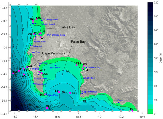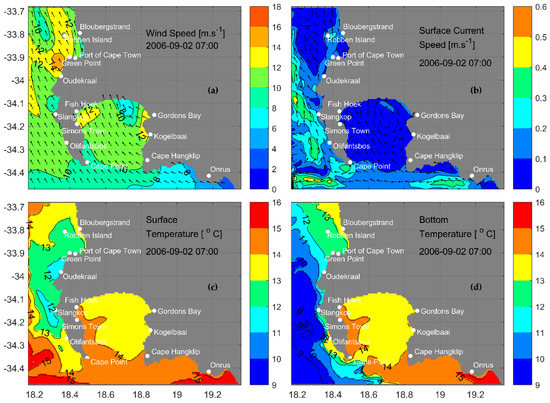 The Cape Peninsula area, situated along the southwest coast of South Africa, is defined by Table Bay to the north and False Bay to the south (Figure 1). These bays exhibit complex meteorological-oceanographic dynamics as a result of, among other factors, complex orography, bathymetry [1] and coastal orientation, and the meeting and mixing of warm Agulhas Current waters and cold Benguela currents [2,3,4].