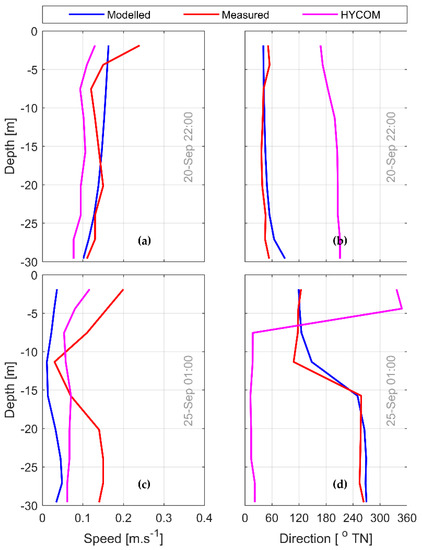 Finally, while calibration was not performed in the vertical sense, vertical profiles as produced by the final HRM configuration were investigated. All three products were interpolated to the HRM vertical grid for fair comparison. In most cases the vertical velocity profile is reasonably well reproduced, though there are occasions where both models fail to simulate reversals at certain depths. These cases are few and far between for the calibration period, however. Figure 3a,b show the case of a homogenous vertical profile. Figure 3c,d show the case of a directional reversal (~150°) with depth roughly between 11 and 15 m, which is well simulated by the HRM and absent from the coarse global model. It should be borne in mind that currents are weak and variable throughout the simulation period, however, and are therefore likely to exhibit higher relative variability.