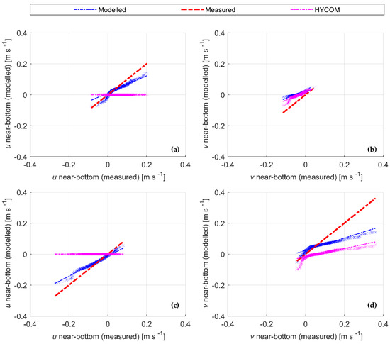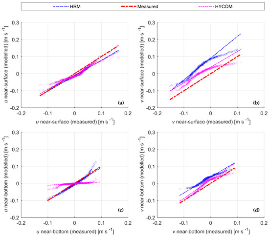 Quantile-quantile plot of near-surface (a,b) and near-bottom (c,d) velocity components at CU4, near Gordon’s Bay.