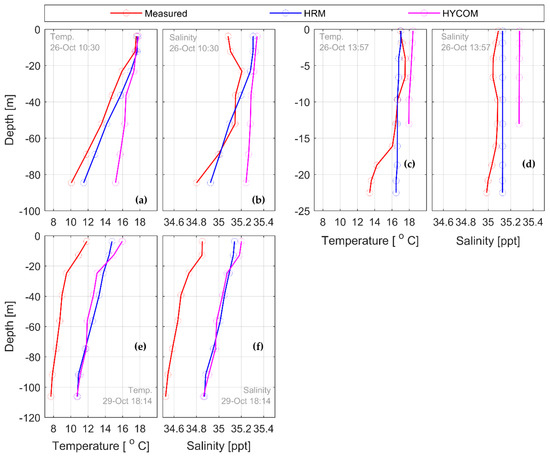Comprehensive temperature and salinity data were mostly unavailable for the study period, precluding their inclusion in calibration and preventing meaningful validation. Several snapshot temperature and salinity profiles were available from the World Ocean Database; however. Figure 6 shows snapshot comparisons between measured profiles and the closest matching model profiles in space and time at three different points in the study domain. Both the HYCOM and measured profiles are linearly interpolated to the HRM grid for fair comparison. These comparisons provide, at best, limited insight into model performance, given the instantaneous nature of the measurement and little available information regarding measurement accuracy. South of Cape Point (TS4), modelled temperatures and salinities from the HRM agree closely with measurements, with RMSEs of 0.89 °C and 0.13 ppt, respectively, in a water column of more than 80 m. This represents an improvement over the global model, which produces RMSEs of 2.76 °C and 2.48 ppt. Surface temperatures agree very closely, with sensitivity tests revealing this to be the result of including surface heat flux forcing. In the shallows of False Bay near Gordon’s Bay (TS5), surface temperatures are again accurately simulated, but the HRM fails to produce a slight warming between 2 and 7 m, and a cooling thermocline below 15 m. The limitations of model bathymetric resolution are made clear here, with the HYCOM model only producing results to a depth of between 10 and 15 m. West of the Peninsula (TS9), the HRM reproduces the shape of the temperature and salinity curves, but a constant overestimation throughout the water column is evident. Preliminary testing revealed the potential in the correction of temperature and salinity boundary condition biases towards improving these results, though a full appraisal in this regard is beyond the scope of the present study. Though robust validation of GOFS 3.1 temperature and salinity in this area is lacking, Ref. [38] determined the product to show a 38% agreement in SST with radiometer measurements at a near-co located point within False Bay, and tending generally to overestimate. Furthermore, during data assimilation experiments with a research HYCOM configuration, Refs. [93,94] noted warm SST biases in the Benguela region, which are exacerbated by the assimilation of sea-level anomaly data (GOFS 3.1 assimilates sea surface height data). Sub-surface validation of GOFS 3.1 temperatures and salinities is lacking, but these studies point to the possibility of biases in HYCOM temperature boundary conditions which might propagate into the HRM domain. Another noticeable feature is the similarity between the HYCOM and HRM profiles. This is due to the proximity of the profile location to the HRM model boundary. Similar plots to those in Figure 6 were produced for all available measured profiles (and their basic performance metrics given in Table A3).