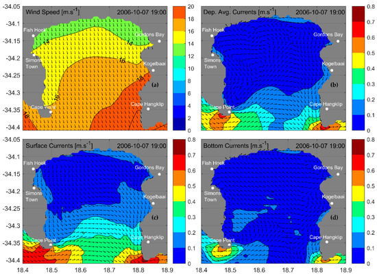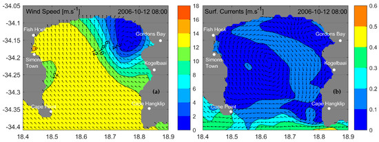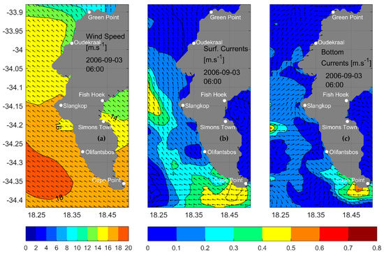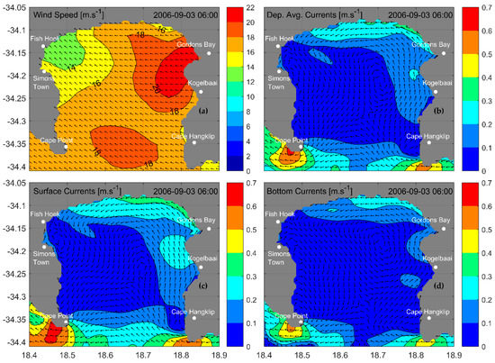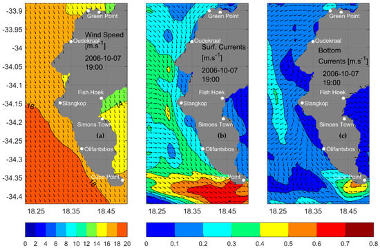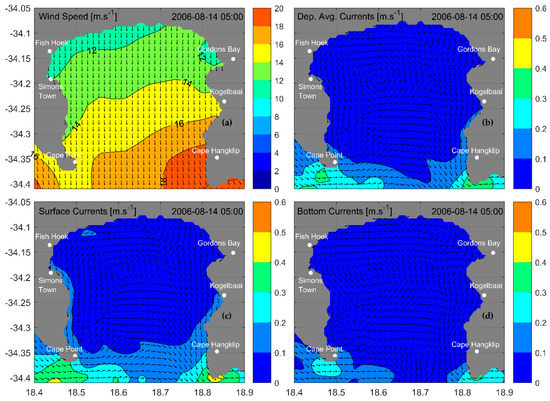 Several south-easterly events were inspected in terms of the hydrodynamic response. The expectations established by the literature are qualified in that while previously observed response features are produced by the HRM, these features do not always occur in response to similar forcing. An expected result is relatively strong westward flow south of False Bay, becoming north-westward along the south-western coastline of the Cape Peninsula, with little vertical shear (Figure 7). Offshore of Olifantsbos and extending as far as Table Bay; however, surface flows continue to the north-west while bottom flows turn eastward, presumably to balance the surface divergence. Flow speeds decrease north of Oudekraal, with weak northward flow between Oudekraal and the northern extent of the study domain, even under relatively strong south-easterly wind events. Velocity maxima appear regularly in the vicinity of prominent headlands; for example, near Cape Hangklip, Cape Point and Slangkop. Close inspection of Table Bay reveals weak northward drift under south-easterly winds (Figure 8), but this needs further qualification (discussed later in this section). Water is seen entering between Green Point and Robben Island, and exiting between Robben Island and the mainland. This agrees with the observations of a so-called “anticyclonic” flow under south-easterly winds by Ref. [5]. Surface and bottom flows were similar in Table Bay, with little evidence of significant vertical shear.
