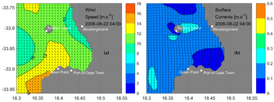 Salinities were fairly homogenous throughout the Bay, ranging between 34.4 and 35.5, but mostly between 34.7 and 35.3 [5]. Sea temperatures in Table Bay appear to be strongly influenced by nearby wind-driven upwelling centres; specifically Cape Columbine to the north, and Oudekraal and Slangkop just a few kilometers to the south [4,6,28]. From August-October (the simulation period for this study) mean SSTs of 13–14 °C can be expected in Table Bay [28].