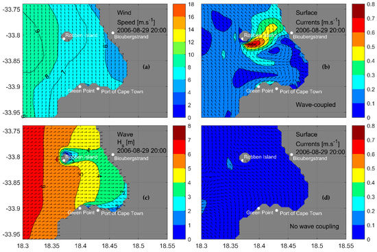 Space-time varying 10 m winds from the Wind Atlas of South Africa [79], which is a downscaling of the ERA-Interim (ERA-I) reanalysis product [80] using the Weather Research and Forecasting model [81], are applied to the wave and circulation models. The forcing has a horizontal resolution of 0.03°, or roughly 3 km and a 1-h temporal resolution. Hourly sea-level pressure data are applied to the coupled wave and circulation models in order that inverse barometric forcing on water levels is included. These space-time varying data are taken from the ERA-I product [82] for coherence with the wind forcing. ERA-I has a resolution of approximately 79 km but is also provided at a resolution of approximately 13.9 km (used here) via ECMWF’s bi-linear interpolation technique for continuous variables. Total cloud cover, 2 m air temperature and dew point temperature variables are also taken from ERA-I, the latter two from which relative humidity is computed. Two m air temperature, relative humidity and total cloud cover are then supplied to the HRM to force surface heat fluxes. Heat fluxes are computed by Delft3D’s Ocean heat flux model following Refs. [83,84]. The effect of Newtonian gravitational forces on the water mass within the HRM domain is accounted for via the most important semi-diurnal, diurnal and long period harmonic constituents (11 in total). While some very small-scale coastal models neglect this forcing, increasing domain size, deeper bathymetric regions and/or the modelling of enclosed basins require that these gravitational effects be accounted for [45].