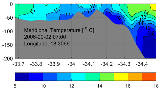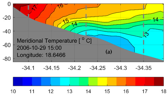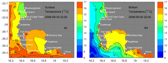 Density dynamics in the Bay are predominantly temperature controlled, with only weak contributions from salinity [37]. Temperature is affected by wind via upwelling and advection of cold water, with insolation playing a secondary role, especially in the northerly and north-easterly shallows [8,34,35,37]. Ref. [38], however, determined waves to control nearshore temperatures to a greater degree than wind. The most notable thermal feature is upwelling of cold water north-west of Hangklip, and to a lesser extent, Gordon’s Bay, in response to strong south-easterly winds [22,34,35,37]. Upwelling was also observed along the coastal stretch up to 20 km east of Hangklip, in turn supplying cold water to both Hangklip and the interior of the Bay [18,37]. The Bay is generally thermally stratified in summer, with a well-developed thermocline and relatively higher vertical temperature variability. It is generally well-mixed and uniformly colder in winter [8,18,34,35]. SSTs during the simulation period for this study (August-October) could be expected to range between 14.5 and 17 °C [34].