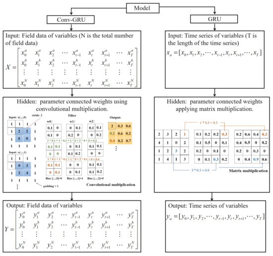 The main frameworks of the GRU and Conv-GRU models are input layer, hidden layer, and output layer. The former predicts single point time series while the latter forecasts field data, so they have different types of outputs. A particularly obvious difference between them is the computation of the hidden layer, which operates on the input signal through different connections for the ultimate purpose of forecasting time series or field data, as shown in Figure 2.