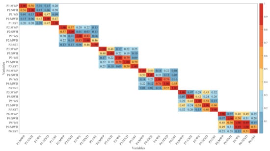 To avoid the inclusion of redundant information and the omission of important information, the correlations between the input variables MWP, SWH, WS, MWD, and SST need to be further explored. Figure 3 shows the correlation matrix between the input variables at each point from P1 to P6, thus enabling a quantitative understanding of them. Furthermore, the correlation of the input parameters to MWP would like to be expressed qualitatively and graphically.