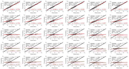 Scatterplots of observation and forecasting obtained in different experiments using the Conv-GRU model with a 6-h lead time. The subplots from top to bottom represent the first five experiments in Table 3, respectively. The subplots from left to right correspond to P1 to P6. The red line indicates a linear fit and the black line means a full correlation.