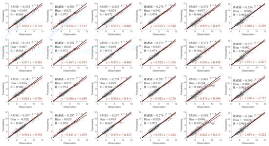 The experimental results are presented in Figure 4 and Figure 5, respectively, according to the number of input variables. The former shows scatterplots of observation and forecasting obtained after the univariate experiments, while the latter depicts the results of multivariate experiments.