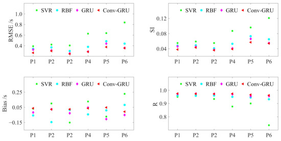 Performance of the SVR, RBF, GRU, and Conv-GRU models.