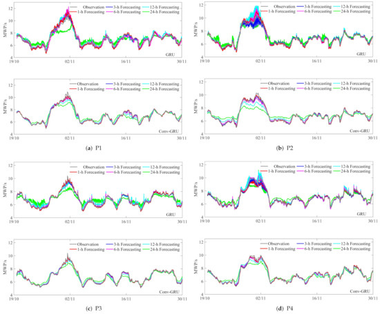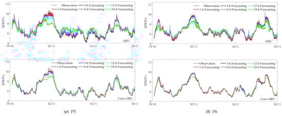 Time series plots of the GRU and Conv-GRU models at six locations, where (a–f) represent P1-P6. Each subplot is split into two plots, the upper one showing the experimental results obtained from the GRU model, on the contrary, the lower one reflecting the content obtained by the Conv-GRU model. The gray and red (blue, magenta, cyan, green) curves depict the observation and 1-h (3, 6, 12, and 24-h) forecasting under the different models, respectively. The X-axis is the time series corresponding to the test set in 2018.