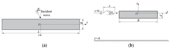 In the hydrodynamic analysis, the fluid is assumed to be inviscid and incompressible, and the fluid motion is irrotational. The classical linear potential wave theory is adopted for modelling the fluid motion. The breakwater is modelled as a plate [20]. Note that the linear wave theory has been widely adopted for estimating the transmission coefficients of floating breakwaters, e.g., in research study [1] and in design guidelines [21]. It is expected that the accuracy of transmission coefficients obtained by using the linear wave theory decreases as the wave steepness (i.e., the ratio between the wave height and wavelength) increases. However, the limit of wave steepness where the linear wave theory can still be valid has not been clearly established due to the lack of comparison between numerically estimated and measured transmission coefficients. The validity of the linear wave theory is also affected by the breakwater configuration and cross-sectional shape. An existing comparative study [22] between measured and numerically estimated transmission coefficients obtained by using the linear wave theory showed that for box-type floating breakwaters and wave steepness of about 0.04, a good agreement between experimental and numerical results was obtained. For a larger wave steepness of about 0.07 and the Berkeley Wedge breakwater, the difference between the numerically estimated and measured transmission coefficients was shown to be up to 35% at resonance [23].