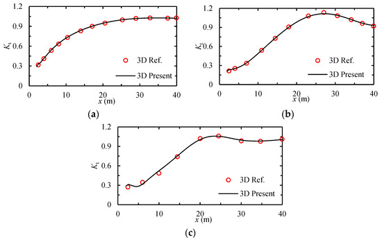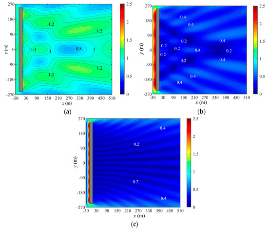 Transmission coefficients along y = 0 and 2 m ≤ x ≤ 40 m, θ = 45°: (a) B/λ = 0.3, (b) B/λ = 0.6, (c) B/λ = 1.1.