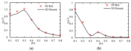 The FE-BE method was implemented in MATLAB, and its convergence, accuracy and validity were confirmed by comparing with the results reported by Diamantoulaki et al. [6] who also used the boundary element method (BEM) for solving the fluid part, but a semi-analytical approach for solving the structure part. The breakwater has L = 20 m, B = 4 m, d = 0.77 m and is subjected to regular waves with θ = {0°, 45°}, and B/λ = [0.1, 1.1]. The water depth h = 10 m. The transmission coefficients along y = 0 and 2 m ≤ x ≤ 40 m are presented in Figure 2. The normalized heave motion amplitudes (|u3|/A) of the breakwater are given in Figure 3. The results reported by Diamantoulaki et al. [6] are indicated by ‘3D Ref.’, while the results from the present study are indicated by ‘3D Present’. It can be seen that the present results are in good agreement with the results obtained by Diamantoulaki et al. [6].