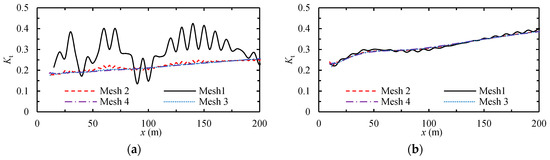 Transmission coefficients for mesh 1 (10 m × 10 m), mesh 2 (5 m × 5 m), mesh 3 (3.33 m × 3.33 m), mesh 4 (2 m × 2 m): (a) ω = 1.57 rad/s, (b) ω = 1.05 rad/s.