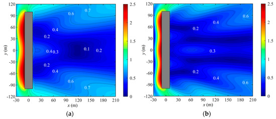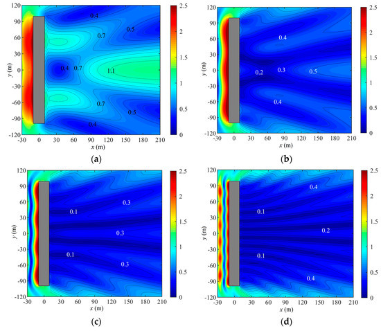 Figure 5 and Figure 6 show the contours of the wave elevation amplitude normalized with respect to the incident wave amplitude of regular waves for FB#1 and FB#1L. The contours of the normalized wave elevation amplitude behind the breakwaters reflect the transmission coefficients. It can be seen from Figure 5 that the transmission coefficients generally decrease as B/λ increases from 0.2 to 0.63. This result is expected, and has been widely seen for 2D floating breakwaters (e.g., see [32,33]).