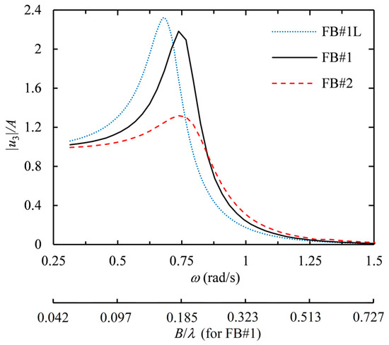 Figure 5 also shows that the transmission coefficients within certain surface areas are larger than unity for relatively long waves (e.g., see Figure 5a). This was also observed from the experimental results for 3D breakwaters integrated with oscillating water column wave energy converters [11]. Such large transmission coefficients cannot be seen in the conventional 2D analysis of floating breakwaters (e.g., see results reported in [1,35]) due to the conservation of energy. This indicates that the large transmission coefficient phenomenon results from the 3D diffraction and radiation. Let us consider a 3D diffraction problem where the motion of FB#1 is not considered. Figure 7 shows the transmission coefficients for the diffraction problem. It can be seen from Figure 7 that all the transmission coefficients in the wave field behind the breakwater have a smaller unity for FB#1 (without motion) and B/λ = 0.2. For this wave condition and the breakwater FB#1, the large transmission coefficient phenomenon occurs when the breakwater motion is considered (as seen in Figure 5a). For the considered B/λ ratio of 0.2, the corresponding wave frequency is close to the heave resonant frequency (ω ≈ 0.75 rad/s) of FB#1, as seen in Figure 8. The large transmission coefficient phenomenon also occurs for FB#1L and FB#2 when the wave frequency is close to the heave resonant frequency of the breakwater (about 0.65 rad/s for FB#1L and 0.75 rad/s for FB#2, as seen in Figure 8). The occurrence of such a phenomenon for FB#1L can be seen in Figure 6a for B/λ = 0.15 (or frequency of 0.65 rad/s). Figure 5 and Figure 7 also show that due to the effect of 3D diffraction and radiation, the normalized wave elevation amplitude may be close to, or even higher than, 2 in the region just in front of the breakwater. This phenomenon was also observed in a previous numerical study [6] on 3D floating breakwaters.