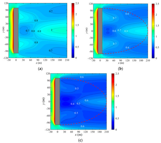 Contours of normalized significant wave height for FB#1 under irregular waves, θ = 0°: (a) ωs = 0.785 rad/s, (b) ωs = 0.911 rad/s, (c) ωs = 1.047 rad/s. Semi-elliptical area bounded by lee side of breakwater and red dashed semi-ellipse is assumed to be the area of interest (in Section 3.2.2).