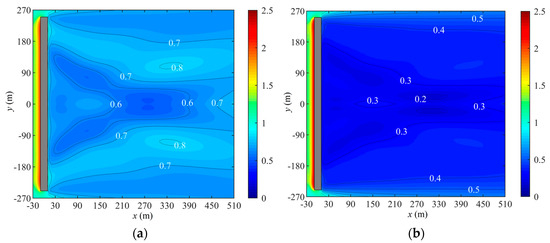 Contours of normalized significant height for FB#1L under irregular waves, θ = 0°: (a) ωs = 0.785 rad/s, (b) ωs = 1.047 rad/s.
