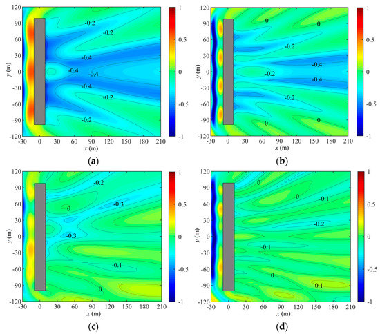 Contours of normalized wave elevation amplitude for FB#1 under regular waves, θ = 0°, L/B = 10: (a) B/λ = 0.2, (b) B/λ = 0.27, (c) B/λ = 0.36, (d) B/λ = 0.63.