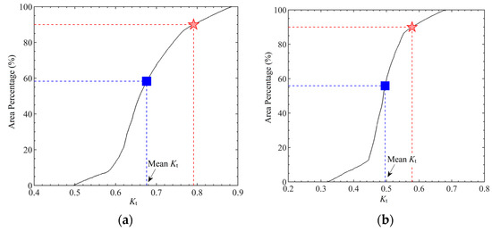 Transmission coefficient versus area percentage (black solid line) for FB#1, θ = 0°, irregular wave: (a) ωs = 0.911 rad/s, (b) ωs = 1.047 rad/s. Square blue marker indicates mean transmission coefficient and corresponding area percentage. Red star marker indicates 90% area percentage and corresponding transmission coefficient.