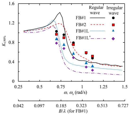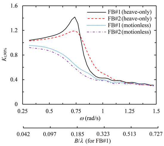 Figure 14 shows the representative transmission coefficient Kt,90% for the heave-only and motionless breakwaters FB#1 and FB#2. It can be seen that when the breakwaters are fixed, FB#2, with a larger width, is more effective than FB#1 in attenuating incident waves. Their associated representative transmission coefficients increase as the wave frequency decreases and are generally significantly lower than the representative transmission coefficients for the heave-only FB#1 and FB#2. The difference in the representative transmission coefficient between the motionless breakwaters and the heave-only breakwaters indicates the necessity of considering breakwater motions in the hydrodynamic analysis. Figure 14 also shows that the representative transmission coefficients for the motionless breakwaters (i.e., diffraction problems) are always smaller than unity, and the large transmission coefficient phenomenon (Kt,90% > 1) only occurs for the heave-only breakwaters (i.e., combined diffraction-radiation problems). Such a large transmission coefficient phenomenon may result from the interaction between the diffracted waves and the radiated waves for wave frequencies close to the heave resonant frequency of the breakwater (as discussed in Section 3.1).