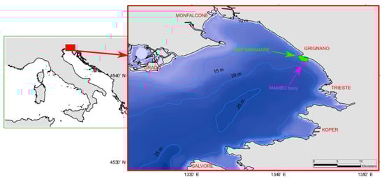 The Gulf of Trieste, with 18 m average depth, is the area (approximately 500 km2) encompassed by the shore line of the northeasternmost part of Italian peninsula and Slovenia bordered by the virtual line between Grado (IT) and Piran (SLO) (20 km length) [44,45] and isolated from the rest of the Adriatic by a sill, from Grado to Salvore peninsula [46] (Figure 1).