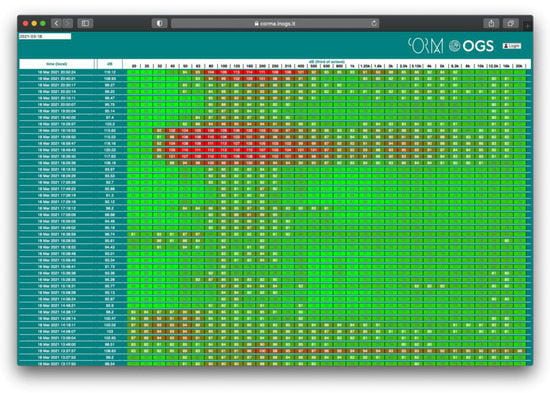 The web portal (https://corma.inogs.it (accessed on 6 April 2021)) [57] where the one-third octave band values are graphically represented in real time. It is easy to identify periods where the level of noise is higher and also in which frequency range.