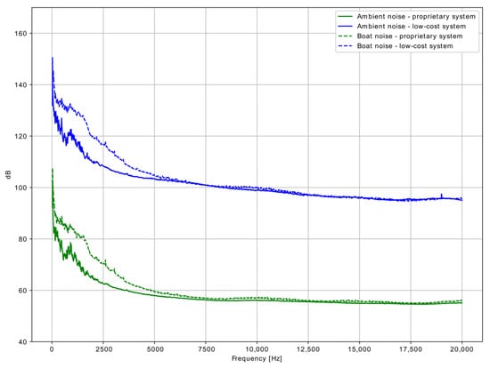 Comparison of spectra obtained from the reference proprietary system (green) and the low-cost system (blue) in the case of ambient noise (solid line) and a known noise source: a boat (dashed line); the difference in gain is due to the difficulties in controlling the gain of the low-cost sound interface.