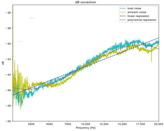 The differences between them are assumed to correspond to the filtering effects of the low-cost acquisition system (Figure 9). It can be noted that corrections are negative, meaning that the low-cost system tends to overestimate the SPL. This is likely due to the difficulties in setting the gain of the digitizer, meaning that an excessive gain has probably been applied. The filter can then be reversed and applied to the CORMA recordings in order to obtain approximately the SPL that could have been recorded using the proprietary system. In this case, a direct application of a reverse filter would probably be not reasonable. The filtering effect, as can be seen, is frequency dependent and not exactly the same in the case of ambient noise and that of the boat engine. To overcome this, we decided to apply a regression on the available spectra and study two scenarios, namely linear regression and polynomial regression. In the first case, the errors can be of the order of 6 dB, while in the latter case errors are less than +/− 2 dB, which is the nominal accuracy of the hydrophones as reported by the manufacturer.