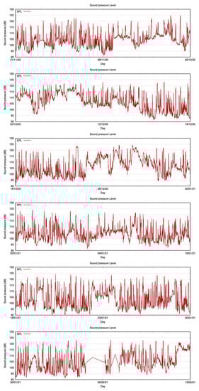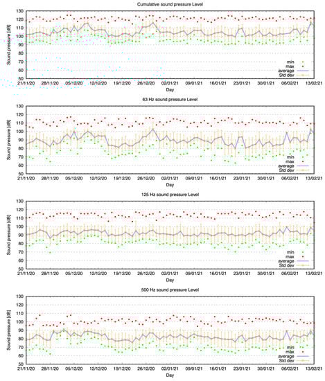 We plotted the heat maps [65] of the SPL at various one-third octave bands (Figure 15) and discovered that especially at 125 Hz throughout all recordings, in a rather restricted range of time between 5 a.m. and 6 a.m., there is a distinct boost in SPL levels. Higher SPL levels are also recorded in the evening, although this is less clearly delimited in time.