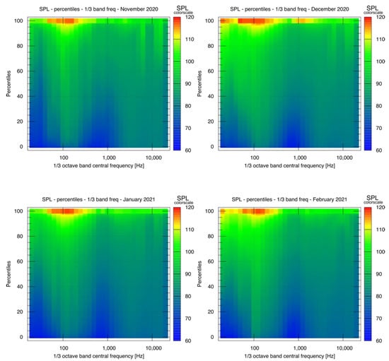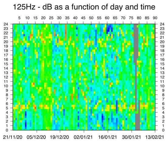 Heat maps that show the distribution of SPL for the 125 Hz one-third octave band as a function of the hour of the day versus day during the period 21 November 2020 and 13 February 2021. It is easy to recognize that in the morning (between 5 a.m. and 6 a.m.) there are high SPL values, probably due to the presence of fishing boats. Higher values can be found also between 7 p.m. and 10 p.m., but they are more spread in time.