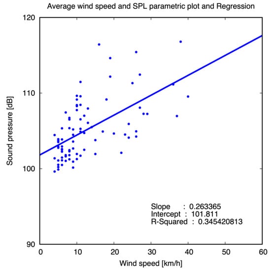 Qualitative correlations can be found (in green in Figure 16), although not all windy periods correspond to distinct increases in SPL. A more quantitative result can be obtained from a parametric plot (SPL versus wind speed, Figure 17), where a linear regression of data points provides an R-squared factor of 0.34.