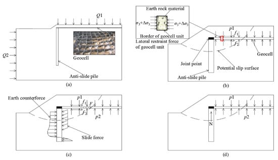 In this study, a theoretical model was first developed to investigate the working mechanism of the anti-slide pile and geocell system for riverbank slope enhancement. The loads applied on the system include the surcharge loading (Q1) of filling, etc., imposed on the top of the riverbank slope and water pressure (Q2) imposed on the left boundary of the riverbank slope. Figure 1b shows the loading condition of the geocells, which is a three-dimensional structure with excellent lateral confinement effect, horizontal friction, pull-out resistance and shear resistance [30]. The model was then validated by the field measurement data.
