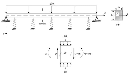 As shown in Figure 2a, the geocell layer can be modelled as a beam on elastic foundation with the loads imposed on the geocell layer, as shown in Figure 1d. The loading on a geocell beam element is shown in Figure 2b. q(x) is the surcharge loading imposed on the top of the riverbank slope Q1, which distributes the loading on the top surface of the geocell layer. p(x, y) is the reaction force on the bottom surface of the geocell layer.