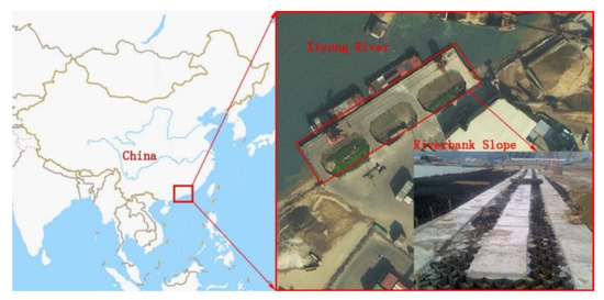 The model developed in this study was implemented to investigate a 391 m long riverbank slope in a port of the Pearl River Estuary in southern China. This riverbank slope had some small-scale landslides in the early stage of construction, as shown in Figure 3 [35]. The height of the riverbank slope is 2.8 m with a slope gradient of 1:2. Figure 4 shows the flowchart of the riverbank slope monitoring system in this study. The riverbank slope model consisted of five anti-slide piles (pre-stressed high-strength concrete, diameter of 40 cm and 37 m long each) with 1 m spacing. To investigate the influence of the anti-slide piles, 1.5 times the depth of the pile was used as the depth of the model. The height and thickness of the geocells were 100 mm and 1.2 mm, respectively, and the geocell layer was filled with sand and aggregate. Due to its weak and soft structure, the riverbank slope was enhanced by anti-slide piles and a geocell layer, with the joint point of the geocells and piles connected by concrete. While sand and aggregate were used to fill the geocell layer, sand cushion was laid under the geocell layer [36]. The details of the material properties of the riverbank slope soil, anti-slide piles and geocells are shown in Table 1. The section of material of the riverbank slope’s soil is shown in Figure 4. Furthermore, these material parameters will be used for numerical analysis.