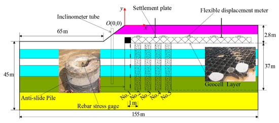 For the proposed riverbank slope reinforcement model, this paper compares model calculations with actual measurements to verify the model’s effectiveness. Compared with the adjacent soil, the geocell structure had higher stiffness and strength, and functioned to diffuse stress and homogenize the riverbank slope deadweight. To a certain extent, the geocell structure can improve distribution of stress from the riverbank slope and anti-slide pile. In the horizontal direction, the geocells have a certain limiting effect on the lateral displacement of riverbank slope and the bending moment of the anti-slide piles. Furthermore, in the vertical direction, the main factor of variation in anti-slide pile axial force is the deadweight of the geocell layer and its upper soil, the anti-slide piles have an excellent supporting effect on the geocell layer, limiting the vertical displacement of the riverbank slope. Therefore, using model calculations, measured values of horizontal and vertical displacements of the slope, axial force end and bending moment of the anti-slide piles, the effect of a riverbank slope that is reinforced by anti-slide pile with geocell can be verified.