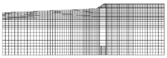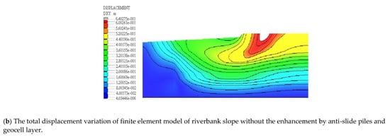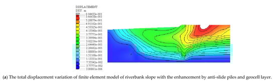In this paper, the riverbank slope reinforced by anti-slide pile and geocell is modeled. The sand and soil are divided into eight-node quadrilateral high-order elements, and the anti-slide pile with geocell layer is divided into line beam elements. The model after meshing is shown in Figure 7; furthermore, the total displacement variation of the model of riverbank slope with and without the enhancement by anti-slide pile and geocell layer. The total displacement includes vertical settlement and lateral displacement. The calculation results are shown in Figure 8. It can be seen from Figure 8 that the total displacement of the riverbank slope is reduced after setting the enhancement by anti-slide piles and geocell layer, which proves the effectiveness of the enhancement by anti-slide piles and geocell layer.
