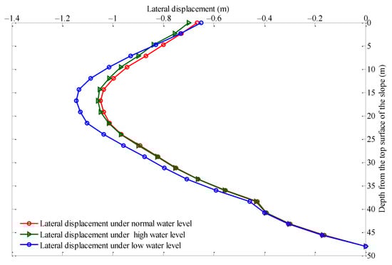 As the left side of the riverbank slope was in contact with water, the influence of water on the riverbank slope should be considered when analyzing riverbank slope stability. However, this influence is complex, and this paper provides a qualitative analysis of the influence of changes in water level through changes in vertical settlement of the top surface of the riverbank slope in the horizontal direction, and the lateral displacement under different water levels. Based on the distance between the water level and the measurement datum, the water levels of the Xiyong River can be divided into high, normal, and low water level. Further, the distance between high water level and normal water level as well as the distance between low water level and normal water level is 1 m. The change curve of the settlement value of the riverbank slope’s top surface at different water levels is shown in Figure 9, and the lateral displacement change of riverbank slope at different water levels is shown in Figure 10. Due to the elastoplastic deformation of geocell, the settlement change and lateral displacement change of riverbank slope are irreversible.