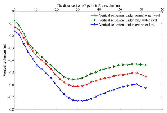 Vertical settlement of the top surface of the riverbank slope in the horizontal direction under different water levels.