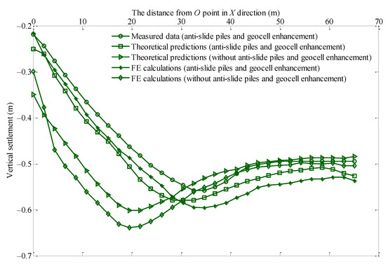The vertical settlement on the surface of the riverbank slope was measured after riverbank slope construction had been completed for a period of time under the high water level. The measurements are presented in Figure 11, which compares the measured and predicted vertical settlement on the surface of the riverbank slope with and without riverbank slope enhancement by anti-slide piles and geocell layer. The results show that the theoretical predictions agreed with the field measurements reasonably well. The maximum vertical settlement of the riverbank slope occurred at around 30 m from the top of the riverbank slope. In addition, the figure demonstrates that the maximum vertical settlement of the riverbank slope enhanced by anti-slide piles and geocell layer could be reduced by 15% compared to that without riverbank slope enhancement, moving the maximum vertical settlement point back to around 10 m. Therefore, riverbank slope with anti-slide piles and geocell enhancement can be effectively reduced by the maximum vertical settlement.