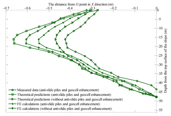 Figure 12 compares the measured and predicted depth-dependent lateral settlement of the riverbank slope, with and without the riverbank slope enhancement by anti-slide piles and geocell layer. It shows that the theoretical predictions fit the field measurements well. In addition, it indicates that the lateral displacement of the riverbank slope initially increased with depth, reached maximum value (around 0.45 m) at around 17 m, and then gradually decreased. Most importantly, the theoretical results demonstrate that the anti-slide piles and geocell layer could decrease the maximum lateral displacement by around 40%.