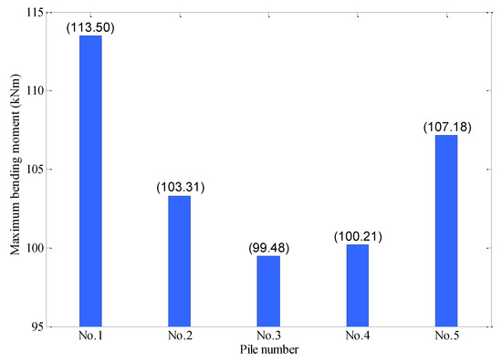 In addition to axial force, the anti-slide piles were also subject to bending moment, which can be calculated using the interaction model of anti-slide pile and soil. Figure 14 shows that the anti-slide piles located at riverbank slope boundaries were subject to a relatively large bending moment. Geocell layer and anti-slide piles are jointly composed of a slope side pressure support system. The outermost No. 1 anti-slide pile is near the free face above the water surface, which bears the force of the soil behind the riverbank slope, anti-slide piles and geocell layer. Therefore, the bending moment of the No. 1 anti-slide pile is relatively large. Furthermore, the No. 5 anti-slide pile is subjected firstly to the force of the soil behind the riverbank slope, so the bending moment is also relatively large. The No. 2 anti-slide pile, No. 3 anti-slide pile and No. 4 anti-slide pile are located in the middle part of the pile group, and undertake the force of the soil behind the riverbank slope and the geocell layer jointly. Therefore, the bending moment of the No. 2 anti-slide pile, No. 3 anti-slide pile and No. 4 anti-slide pile is relatively small.