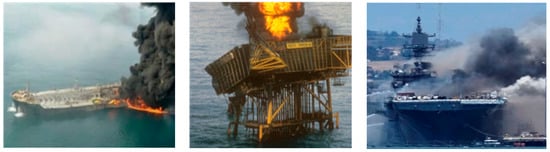 Ships and offshore structures carrying oil and gas are exposed to demanding oceanic and industrial environments with significant fire and explosion hazards. Their structural collapse during fires causes not only significant casualties, but also environmental catastrophes such as oil spills [1]. Many fire accidents on ships and offshore structures have been reported, such as the Sanchi oil tanker accident on 6 January 2018 in the East China Sea and the Piper Alpha accident on 6 July 1998 in the North Sea and the U.S.S. Bonhomme Richard accident on 12 July 2020 in San Diego shown in Figure 1 [2,3].