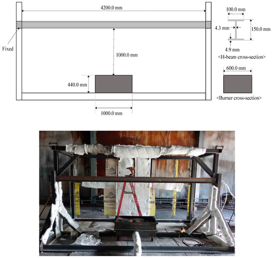A fire experiment on an H-beam commonly used for structural reinforcement in ships and offshore platforms was conducted to obtain data for verification of the thermal-structural analysis technology [29]. The H-beam was 4.20 m in length with a cross-section of 0.10 m (flange) × 0.15 m (web), a 4.90-mm-thick flange and a 4.30-mm-thick web. ASTM A572-50 steel () was used to form the H-beam. The boundary condition of the structure was fixed at both ends without a mechanical load. A sand-diffused propane burner (1.00 m × 0.60 m × 0.44 m) was used as the fuel and the target heat-release rate (HRR) of 1.8 MW verified with a Coriolis mass flow meters was maintained in the experiment. The fire was extinguished after 60 min. The , steel surface temperature and vertical displacement during combustion were measured. Figure 5 shows the experimental setup [29].