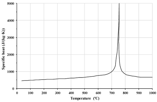 Specific heat of carbon steel as a function of temperature.