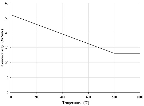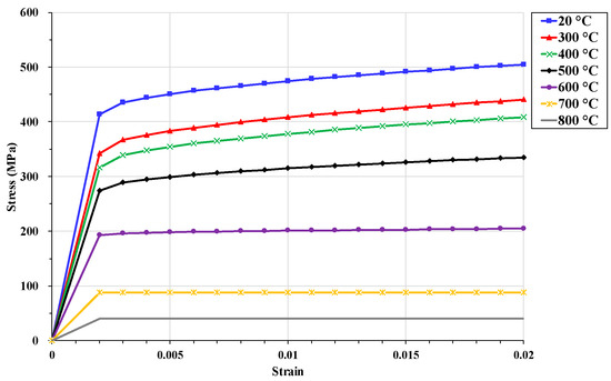 The thermal properties of the structural steel in this study were defined according to the Eurocode [30]. The typical of steel in fire is 0.9. Figure 6 and Figure 7 show the specific heat and thermal conductivity depending on temperature, respectively. To define the stress-strain curve of steel, the representative equations developed by Luecke [36] (Equations (7)–(8)) with , °C, , and are introduced. The elastic modulus and yield strength under elevated temperature are defined by Equations (9)–(10) [36].
