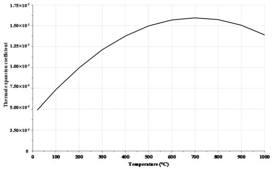 where and are the elastic modulus of steel at room temperature and elevated temperature, respectively and and are the yield strengths of steel at room temperature and elevated temperature, respectively. Figure 8 shows the stress-strain curves calculated by Equations (7)–(10) using the ambient temperature elastic modulus and yield strength of ASTM A572-50 steel (). Equation (11), which was derived by Luecke [36], was used to determine the thermal expansion coefficient () of steel as the temperature increased. Figure 9 shows the of ASTM A572-50 steel as the temperature increased.